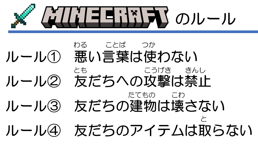 当教室ではマインクラフトをプレイする時にいくつかルールを設けています。